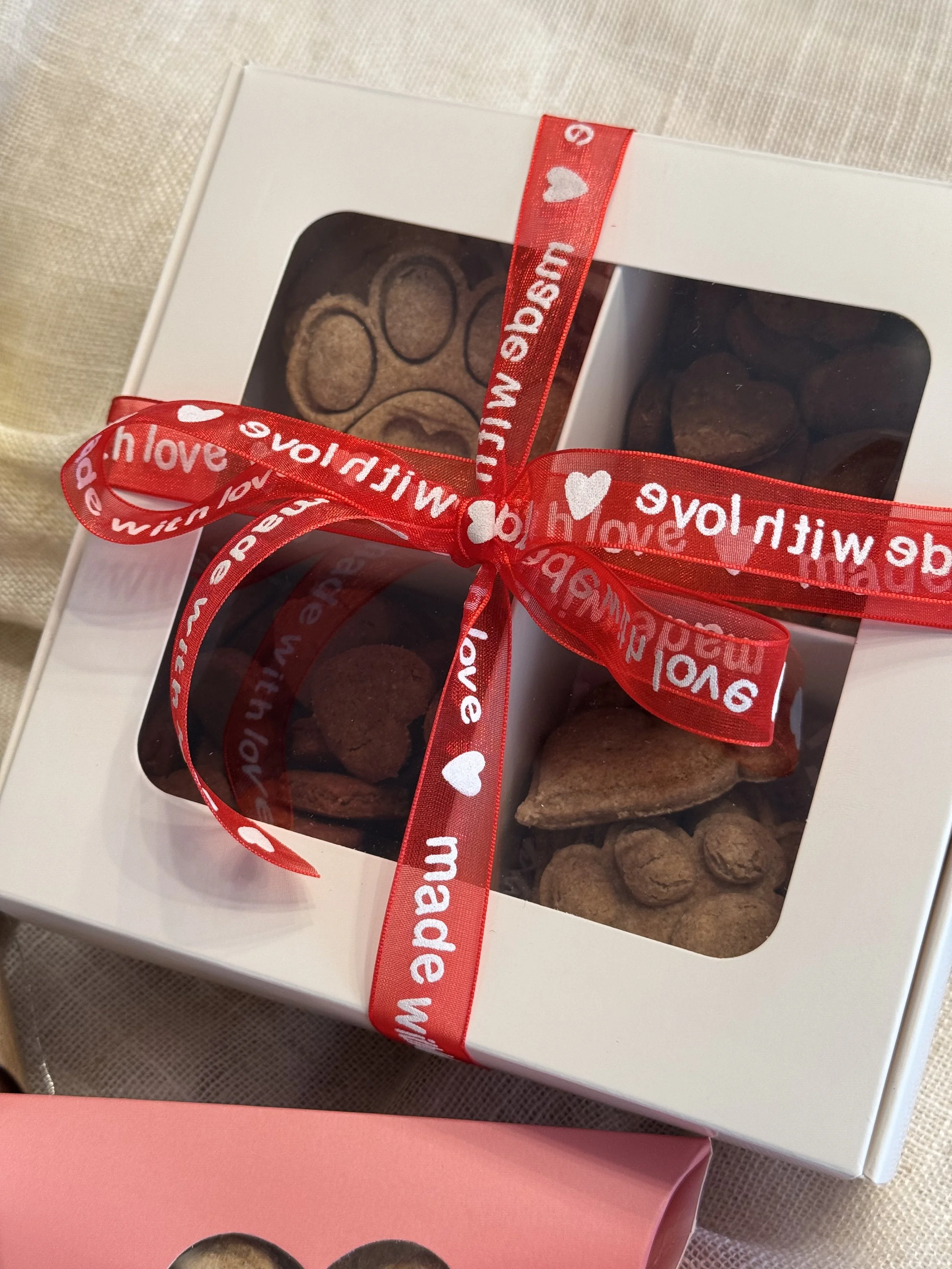 Three different all natural cookies: Peanut Butter Blueberry Heart Cookies (made with organic peanut butter, organic whole wheat flour, organic blueberries, filtered water, organic baking powder), Honey Oat Cookies (made with organic oat flour, organic whole wheat flour, organic honey, organic unsweetened applesauce, organic baking powder, cinnamon), & Peanut Butter Cinnamon Red Heart Cookies (made with organic peanut butter, organic whole wheat flour, filtered water, organic beet root powder, organic baking powder, cinnamon)